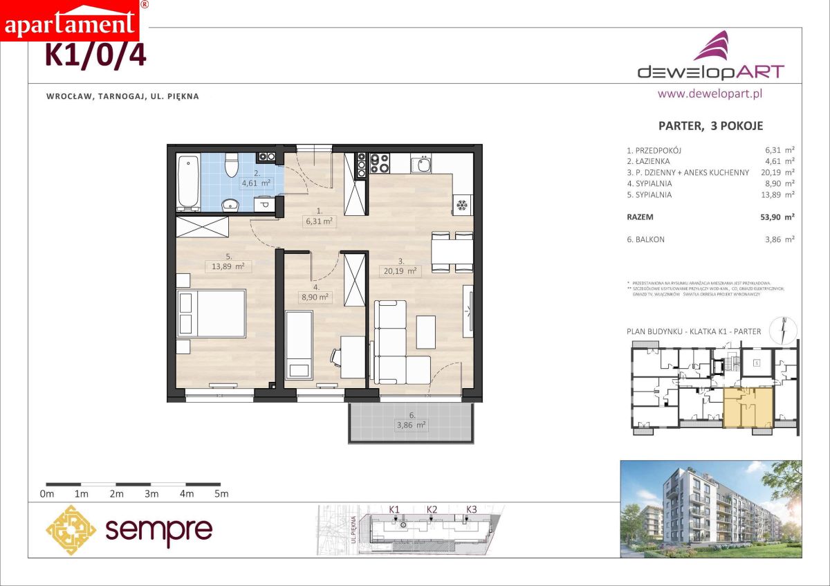 Komfortowe, w pełni wyposażone 3-pokojowe mieszkanie o pow. 53,90 m², z balkonem, położone na wys. parterze nowoczesnego budynku w nowooddanej inwestycji przy ul. Pięknej 66 we Wrocławiu.